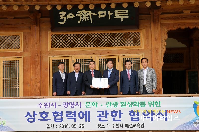 양기대 광명시장과 염태영 수원시장은 26일 수원시 예절 교육관에서 문화·관광 활성화 업무협약을 체결하고, 앞으로 수원·광명 통합형 관광벨트를 구축하고 국내·외 상품개발 및 홍보마케팅을 공동 추진하기로 했다.