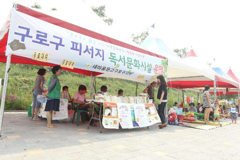 구로구는 안양천 우안둔치에 조성된 물놀이장 내에 천막부스를 설치하고 아동, 일반도서 등 500여권 책을 비치했다.