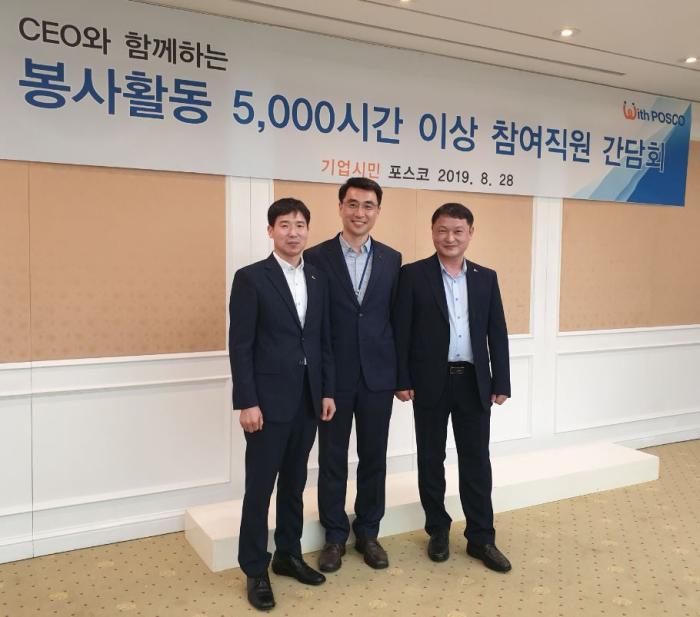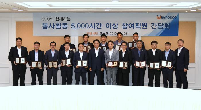 포스코 최정우 회장은 지난 28일 포스코센터에서 5,000시간 이상 봉사활동에 참여한 직원 15명을 초청해 간담회를 갖고 봉사활동을 통해 기업시민을 실천한 여러분이 포스코의 진정한 참모습을 보여줬다고 격려했다.