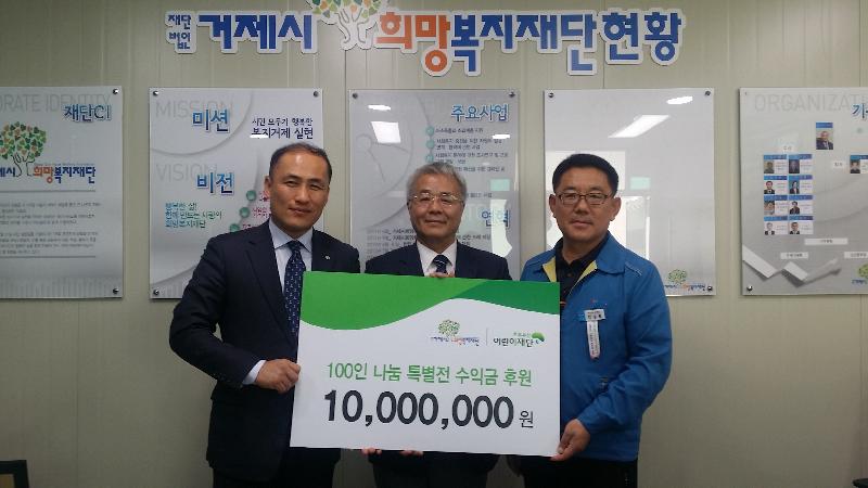 [미디어타임즈 = 최귀복 기자] 거제시희망복지재단(이사장 박동철)은 지난 25일, 지난해 거제시청 본관 1층 및 주차장 일원에서 실시한 ‘100인 나눔 특별전’ 수익금 1,000만원을 초록우산 어린이재단 경남지역본부(본부장 김희석)에 전달goT다.