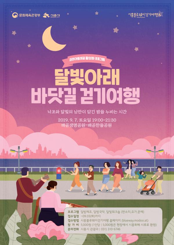 ‘달빛아래 바닷길 걷기여행’은 문화체육관광부 공모사업인 코리아둘레길 활성화 프로그램인 ‘시흥블루웨이 걷기여행’ 첫 번째 여행이다. 배곧신도시의 낙조와 야경을 즐기며 가족, 연인, 친구끼리 달빛과 국악을 주제로 한 다양한 체험을 즐길 수 있는 왕복 6km 걷기 프로그램이다.