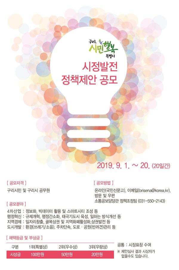 구리시는 9월 1일부터 ‘구리, 시민행복 특별시 구현을 위한 시정 발전 정책제안 공모’를 실시한다.