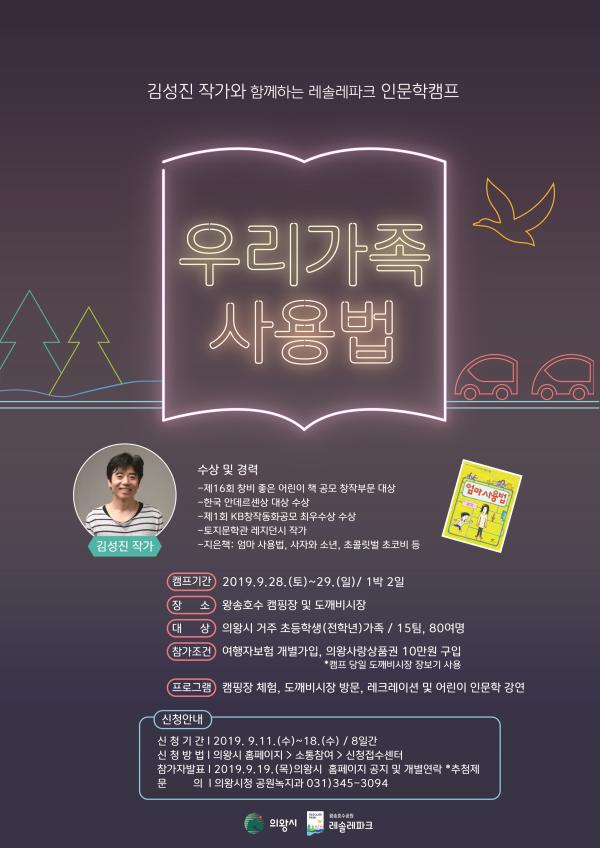 의왕시는 오는 28일부터 29일까지 1박 2일간 의왕 왕송호수 캠핑장 및 도깨비시장에서‘김성진 작가와 함께하는 레솔레파크 인문학캠프’를 운영, 참가 가족을 모집한다.