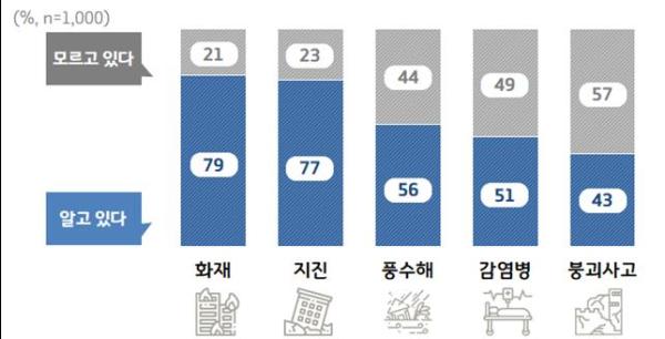 하지만 노력과 별개로 우리 사회가 안전매뉴얼대로 재난 및 사고에 대한 예방, 대응이 되지 않고 있다는 인식은 57%로 다소 높게 나타났다.