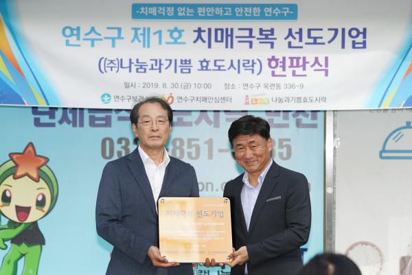 인천 연수구는 지난달 30일 연수구 옥련동 소재 ‘㈜나눔과기쁨효도시락’을 연수구 제1호 치매극복선도기업으로 지정하고 현판식을 개최했다.