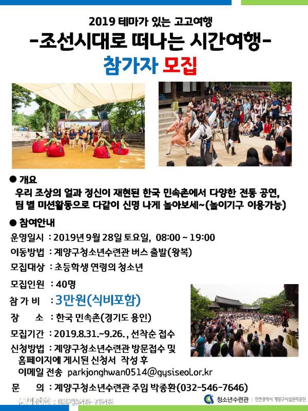 인천 계양구시설관리공단 계양구청소년수련관에서는 2019 테마가 있는 고고여행 ‘조선시대로 떠나는 시간여행2’ 참여자를 오는 26일까지 모집한다.