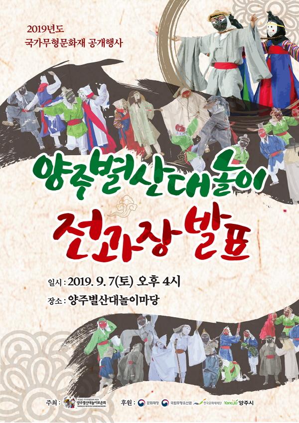 사단법인 국가무형문화재 양주별산대놀이보존회는 오는 7일 오후 4시 양주별산대놀이마당 소공연장에서 2019년 국가무형문화재 공개행사인 ‘양주별산대놀이 전과장 발표’ 공연을 진행한다.