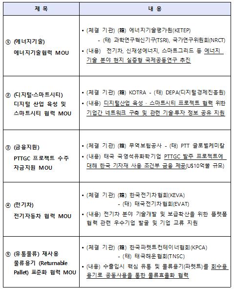이번에 체결된 MOU를 통해 전기차·스마트그리드·ICT·스마트시티 등 미래 신산업 분야에서 한-태 양국간 다양한 협력사업들이 본격 추진될 것으로 예상되며, 태국 국영석유공사가 추진하는 석유 및 가스 프로젝트에 우리기업 참여 기회를 확대하고, 유통물류 용기 표준화를 통한 물류 효율화 등 협력사업도 추진될 것으로 기대된다.