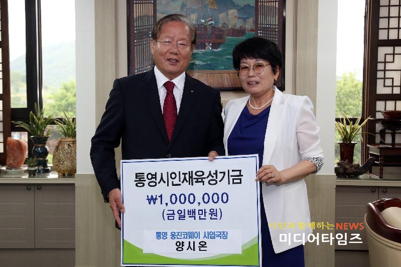 [미디어타임즈 = 최귀복 기자] 지난 27일, 통영 웅진코웨이 양시온 사업국장이 통영시청 시장실을 방문해 통영시 지역인재육성을 위해 써 달라며 인재육성기금 100만원을 기탁했다.