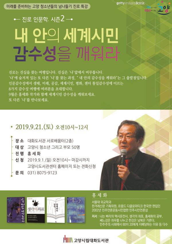 고양시 대화도서관은 진로에 대해 고민이 많은 청소년과 부모를 대상으로 지난 5월부터 오는 12월까지 셋째 주 토요일 8회에 걸쳐 ‘미래를 준비하는 고양 청소년들의 넘나들기 진로인문학, 시즌2. 내 안의 감수성을 깨워라’ 강연이 시민들의 큰 호응 속에 진행되고 있다고 밝혔다.
