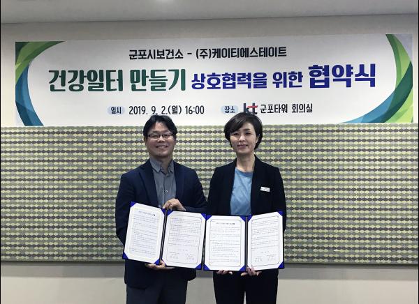 군포시는 지역 내 직장인들의 건강증진을 위해 지난 2일 ㈜케이티에스테이트와 ‘건강일터 만들기’ 업무협약을 체결했다.