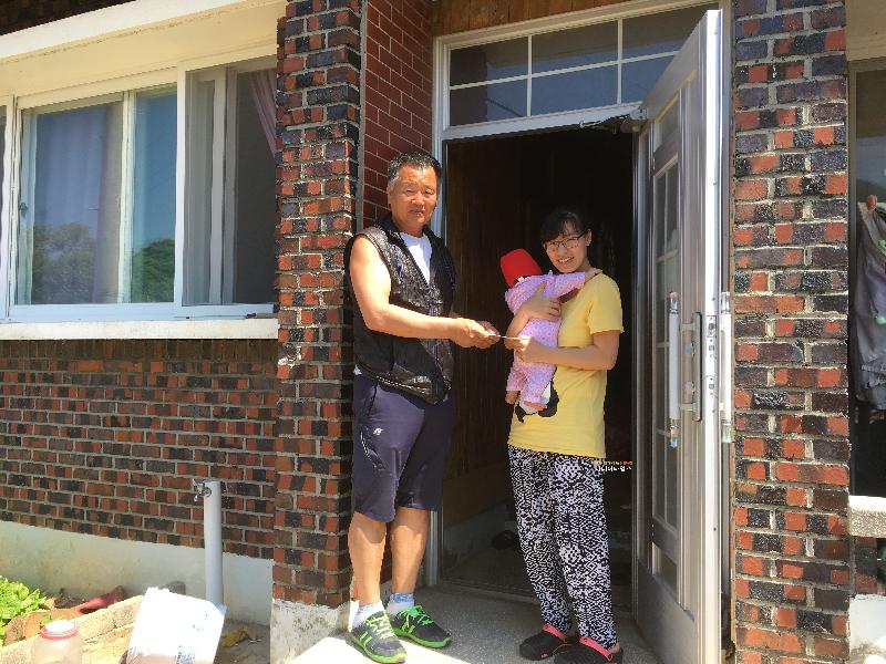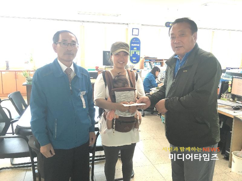 | 27일, 거제시 동부면 주민자치위원회의 특수 시책으로 동부 관내에서 태어난 이가빈 양 가정에 10만원 상당의 출산 축하금을 전달하고 기념사진을 찍고있다. |