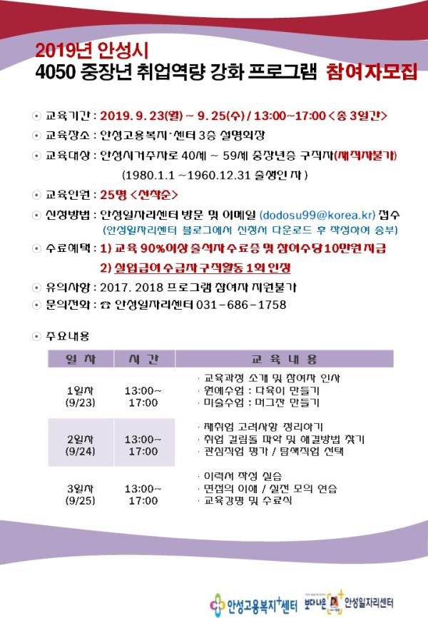 안성시에 거주하는 40세~59세 이하 구직자라면 누구나 신청 가능하며, 현재 총 25명 선착순 모집 중에 있다.