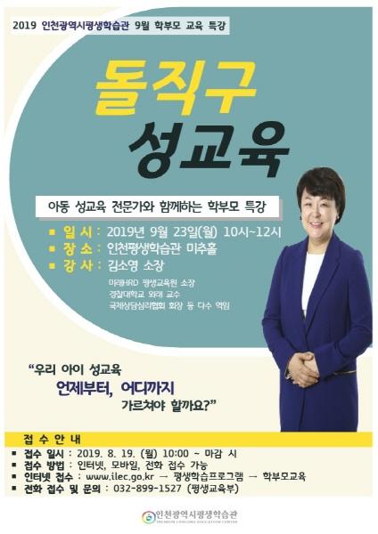 인천평생학습관에서는 오는 23일 오전 10시 미추홀 대강당에서 학부모 대상 자녀 성교육 특강을 실시한다.
