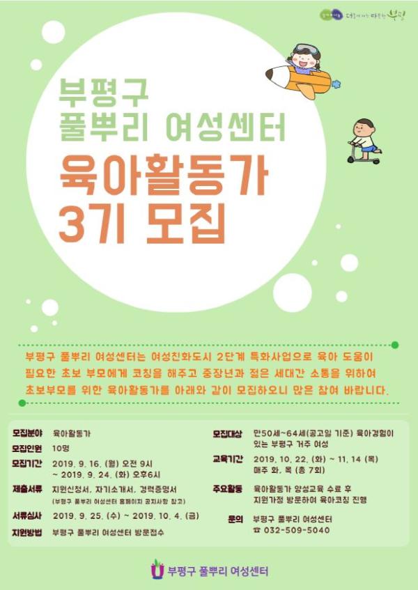 참여를 원하는 주민은 육아활동가 지원서와 자기소개서, 경력증명서, 자격증 사본 등을 부평구 풀뿌리 여성센터로 제출하면 된다.
