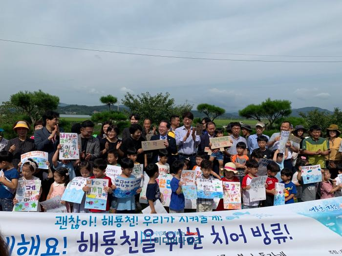 행사는 어린이들이 고사리 같은 손으로 직접 붕어 및 동자개 치어 165천마리를 해룡천으로 보내주었고,‘해룡천아! 아프지마, 우리가 지켜줄게!’란 주제로 직접 집에서 환경을 주제로 그려온 그림이나 어깨띠를 공유하며 환경캠페인도 같이 진행했다.