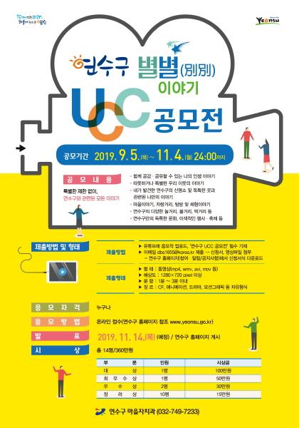 연수구는 주민들의 시선에서 연수구의 구석구석을 느낄 수 있는 다양한 이야기가 담긴 콘텐츠 발굴을 위하여 ‘연수구 별별 이야기 UCC 공모전’을 개최한다.