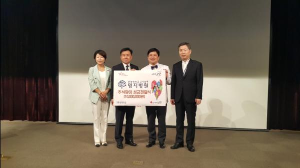 명지병원은 직원 기부금, 병원 지원금, 바자회 수익금 등으로 모인 사랑나눔기금으로 저소득층 환우 의료비 지원사업, 지역사회 저소득층 지원, 국내·해외 의료봉사 활동 지원 등을 추진해 오고 있다. 2017년 3월에는 저소득가정 청소년에게 운동화를 지원했고 같은 해 12월에는 저소득가정에 난방유를 지원해 추운 겨울을 따뜻하게 보낼 수 있도록 도움을 준 바 있다. 또한 2018년에 이어서 이번 추석에도 사랑의 성금 1천만 원을 기탁해 경기북부사랑의열매를 통해 저소득가정에 추석명절 차례비로 따뜻한 사랑을 전할 예정이다.