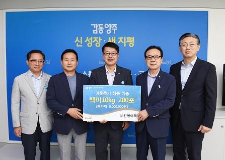 양주시 ㈜진명여객은 지난 3일 양주시청을 방문해 어려운 이웃을 돕는데 써달라며 백미 10kg 200포를 기부했다.