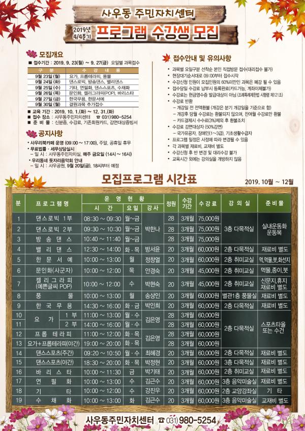 사우동주민자치센터는 오는 23일부터 27일까지 4분기 주민자치센터 프로그램 수강생을 모집한다.
