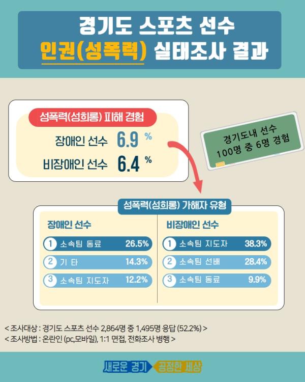 이어 도는 지난 4월 22일부터 6월 21일까지 경기도가족여성연구원이 ㈜케이스탯리서치에 의뢰해 도내 체육단체 소속 선수와 대학·장애인 선수 등 2,864명을 대상으로 온라인 설문조사를 진행했다. 장애인 선수들의 경우 장애유형에 따라 온라인, 1:1 면접, 전화조사 등을 병행했다.