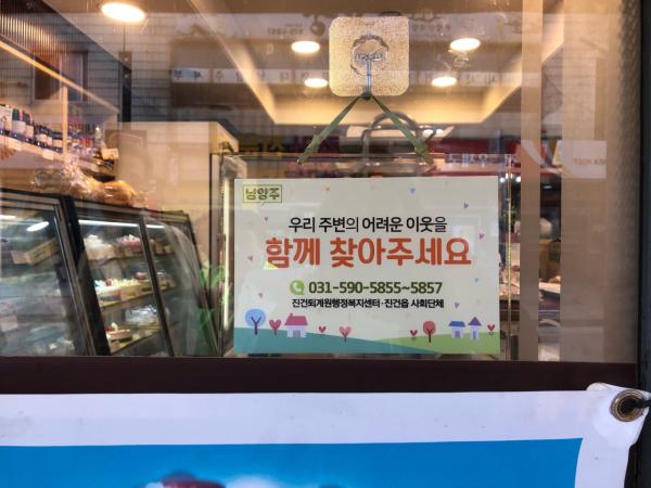 남양주시 진건읍 지역사회보장협의체는 지난 3일부터 지역내 다중이용업소에서 복지사각지대 발굴을 위해‘우리 주변의 어려운 이웃을 함께 찾아주세요.’라는 자체 팻말을 제작하여 홍보활동을 했다.