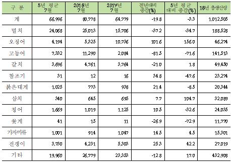 해양수산부는 2019년 7월 연근해어업 생산량이 지난해 7월에 비해 19.8% 감소했다고 밝혔다.