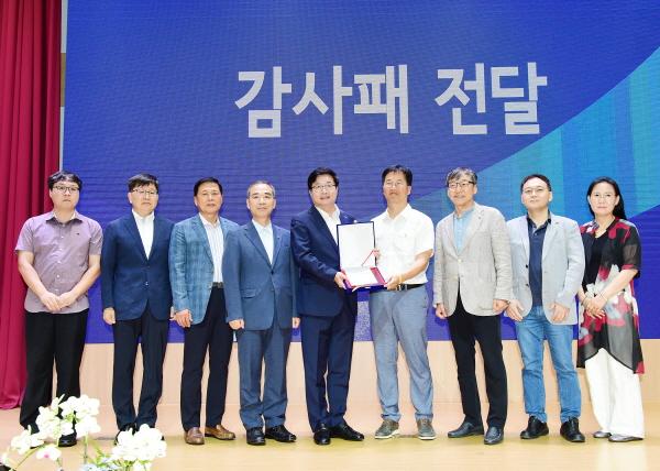 지난 8월 정화조 배기덕트 탈착 사고가 있었던 권선구 A아파트단지 주민들이 4일 수원시청 대강당에서 열린 ‘9월의 만남’ 중 염태영 수원시장에게 감사패를 전달했다.
