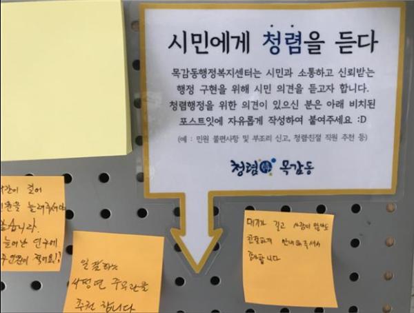 시흥시 목감동행정복지센터가 ‘지역사회와 함께 걷는 청렴목감’ 시책의 일환으로 다양한 시민 목소리를 듣기 위해 동 청사 내에 설치한 청렴 소통 게시판이 긍정적인 반응을 얻고 있다.