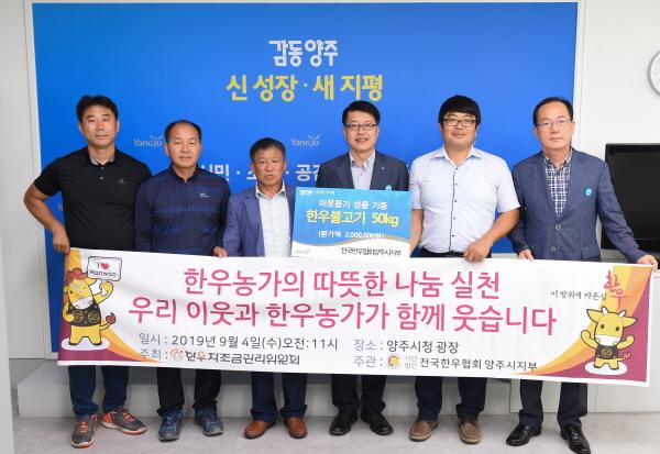 전국한우협회 양주시지부는 지난 4일 양주시청을 방문해 추석 명절을 맞이해 관내 소외되고 어려운 이웃을 돕는데 써달라며 한우 50kg를 전달했다.