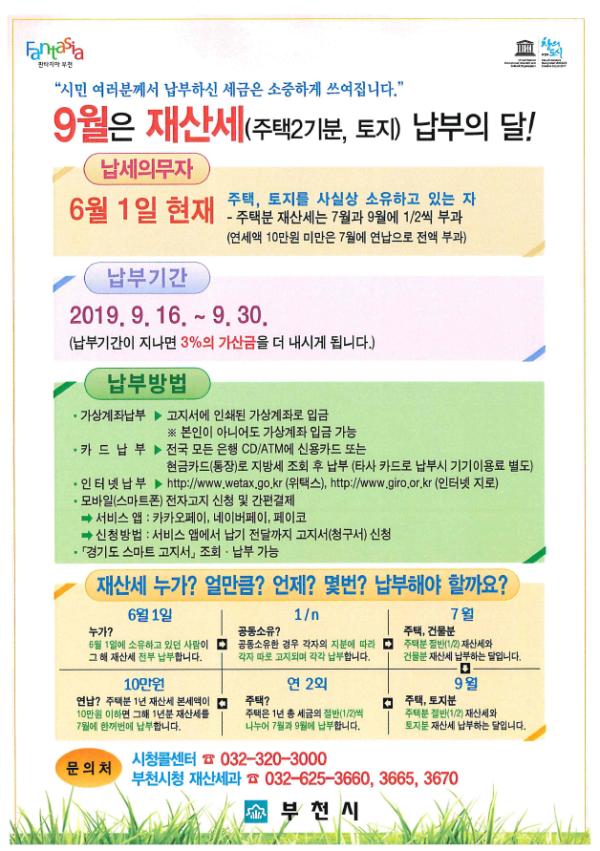 재산세 납부 안내문은 아파트 단지 및 관공서에 부착할 예정이며, 기타 궁금한 사항은 부천시 콜센터, 부과과 재산세팀으로 문의하면 된다.