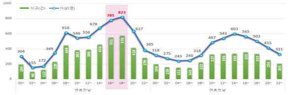 시간대별로 분석해 보면 연휴가 시작되기 전날 오후 6시에서 20시 사이에 가장 많이 발생하고 있어 이 시간대 운전자들의 각별한 주의가 요구된다.