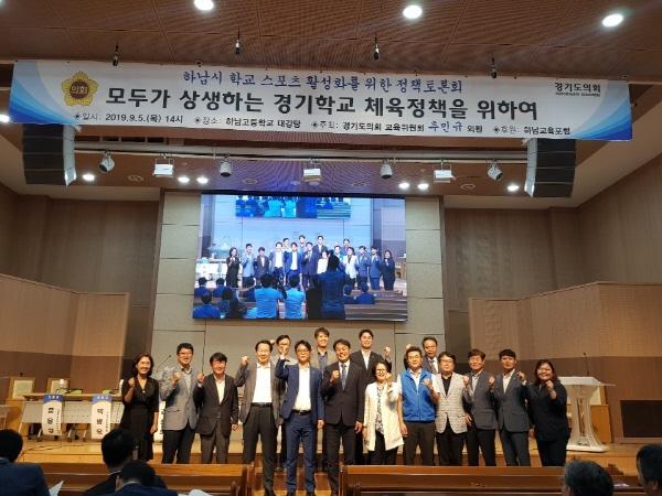 경기도의회 제2교육위원회 추민규 의원은 5일 오후 2시 하남고등학교 대강당에서 하남시 내 각급학교 운동부 관계자 및 학부모 250여명이 참석한 가운데 ‘모두가 상생하는 하남시 학교 체육을 위한 토론회’를 개최했다.