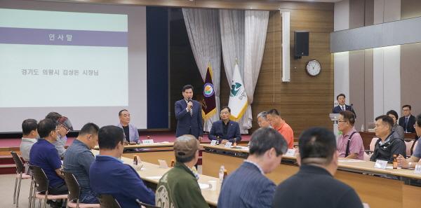 김상돈 의왕시장이 지난 4일 의왕시청 대회의실에서 열린 사)한국신체장애인복지회 경기도복지회 정기 월례회의에 참석해 인사말을 하고 있다.