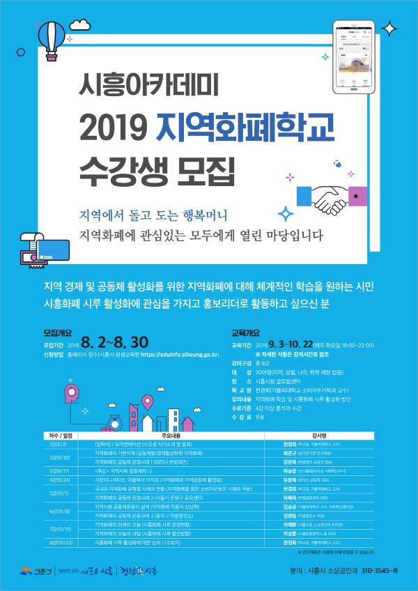 시흥시는 시흥아카데미 ‘2019년 지역화폐학교’를 지난 3일부터 오는 10월 22일까지 매주 화요일 총 8회에 걸쳐 진행한다. 지난해에 이어 두 번째 개강하는 올해 지역화폐학교는 특히 ‘공동체 강화를 위한 지역화폐’ 학습 및 사례공유, 발전 방향 모색을 목표에 두고 있다.