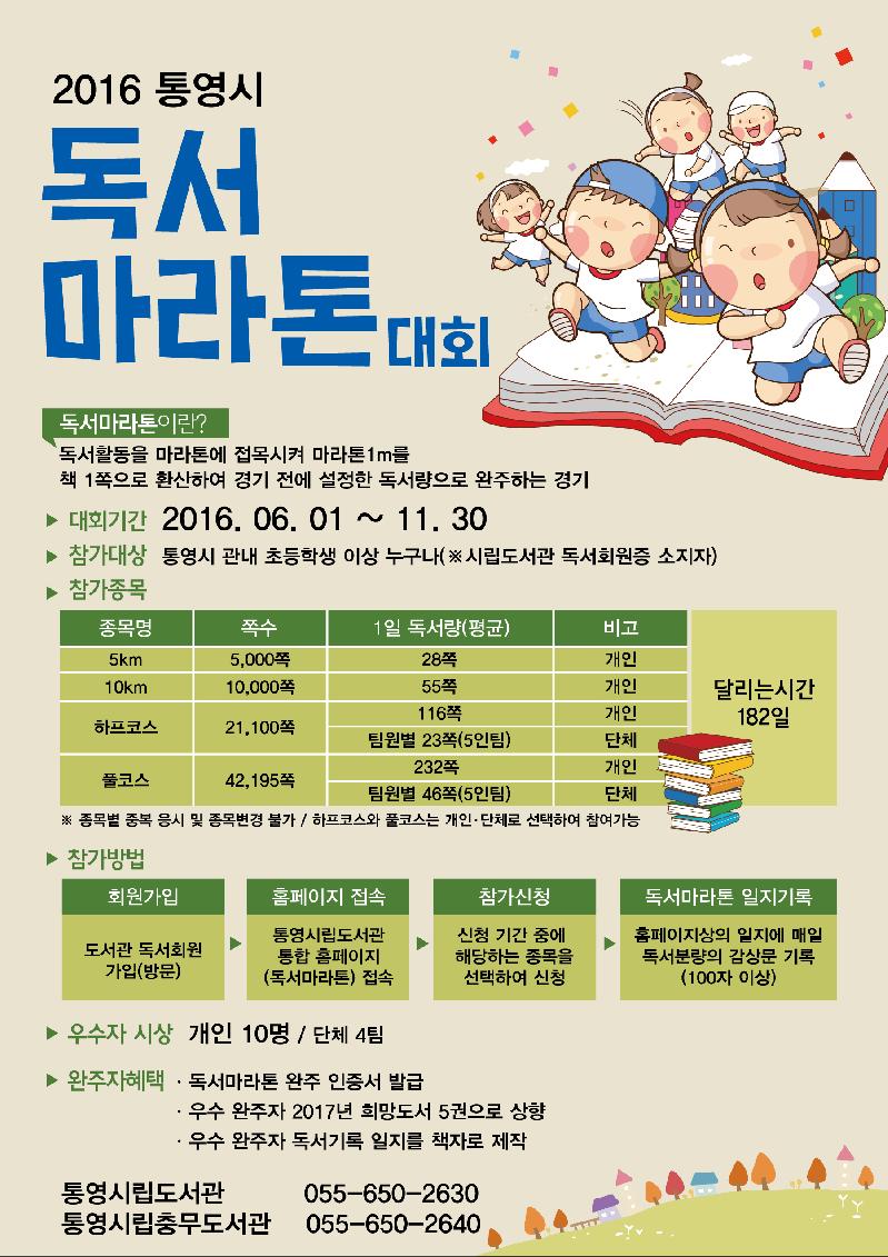 작년보다 더 다양해진 참가종목과 혜택으로 책으로 소통하는 문화 조성에 기여할 것으로 기대되며 자세한 사항은 통영시립도서관(☎055-650-2644)으로 문의하면 된다.