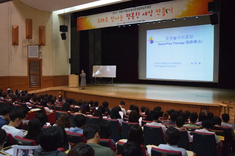 [미디어타임즈 = 최귀복 기자] 거제시는 청소년상담복지센터(센터장 박광복) 주관으로 지난 1일, 청소년수련관 1층 대 공연장에서 관내 어린이집 및 유치원 관계자, 거제대학교 사회복지학과 및 유아교육학과 교수·학생, 청소년유관기관 실무자, 상담교사 및 전문상담사, 그 외 상담전문가 280여명이 참여한 가운데, 김보애 한국모래놀이치료학회장을 초빙하여 ‘모래로 만드는 아름다운 세상 만들기’라는 주제로 지도자 특강을 실시하였다.