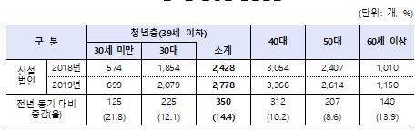 연령별로는 40대, 50대, 30대 순으로 법인을 많이 신설했다. 모든 연령대에서 지난해 7월 대비 증가하였으며 그중 청년층의 증가가 두드러졌다.