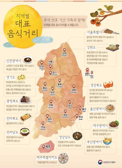 농림축산식품부는 지자체와 함께 추석연휴 기간에 귀성객과 각 지역을 방문하는 관광객이 찾아가서 즐길 수 있는 전국의 특색있는 음식거리를 발표했다.
