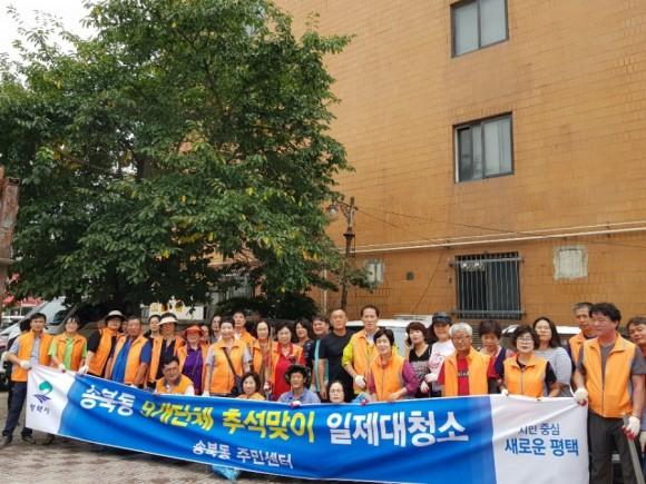 평택시 송북동 9개단체협의회는 지난 4일 송북동 주민센터 직원 등 60여명이 참여한 가운데 추석맞이 일제대청소를 실시했다.