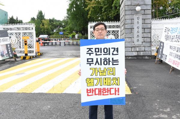 경기도의회 도시환경위원회 박재만 위원장은 6일, 서울시 용산구 국방부 앞에서 양주시 가납리 비행장에 대한 헬기부대 이전 계획 철회를 촉구하는 1인 시위를 했다.