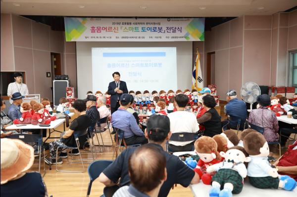 궁동종합사회복지관에서 열린 이날 행사에는 이성 구청장과 대상자로 선정된 어르신 50명이 참석했다. 로봇을 전달하고 사용 방법에 대한 강의와 시연을 진행했다.