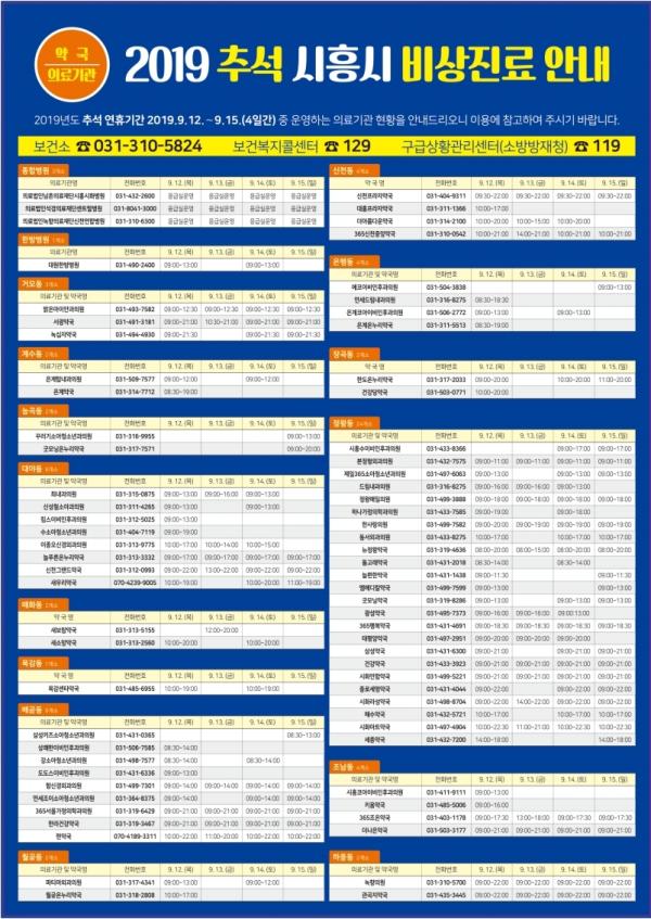 추석 연휴기간 중 비상진료에 대한 내용이나, 인근지역 당직의료기관 및 휴일지킴이 약국 연락처 등에 대해서는 시흥시 보건소나 보건복지콜센터, 119구급상황관리센터, 시도 콜센터를 이용하면 안내 받을 수 있다.