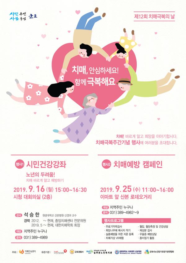 군포시가 ‘제12회 치매극복의 날’인 오는 21일 전후의 치매극복주간에 치매 예방과 극복을 위한 건강강좌와 캠페인을 전개한다.