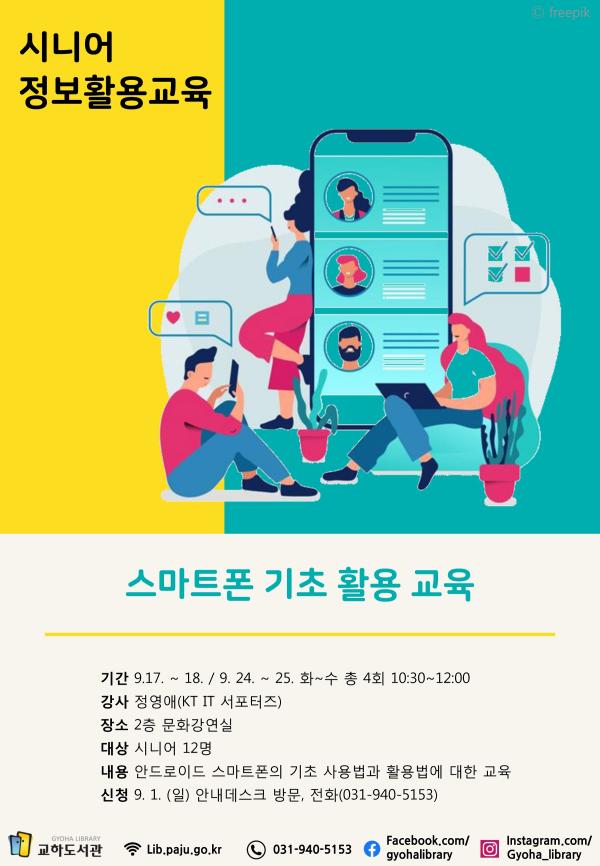 파주시 교하도서관은 장년층을 대상으로 ‘시니어 스마트폰 활용 교육’ 대상자를 모집 중이다.