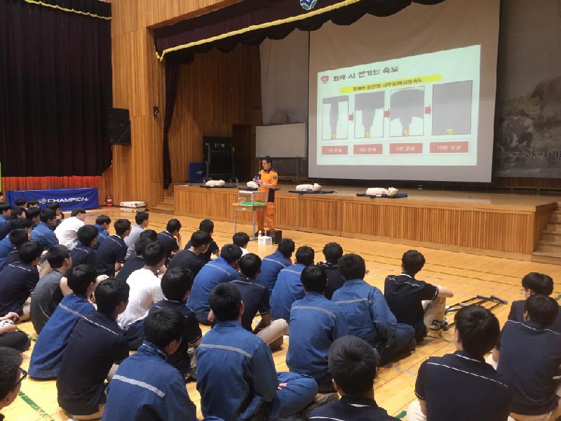 거제공업고등학교 학생들의 수학여행 사전 안전교육과 병행된 이날의 교육에는 거제소방서 SELF 전담교관이 실험기자재를 통해 연소와 소화원리를 재현하여 학생들에게 큰 호응을 얻었으며, 안전한 수학여행을 위한 단체행동 지침, 숙박시설의 소방시설 활용방안, 기타 안전사고 대응방법 및 응급처치요령 등을 교육했다.