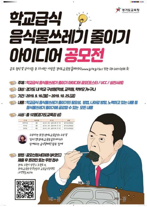 경기도교육청이 오는 16일부터 10월 25일까지 도내 학교 학생, 학부모, 교직원을 대상으로 ‘학교급식 음식물쓰레기 줄이기 아이디어’를 공모한다고 9일 밝혔다.