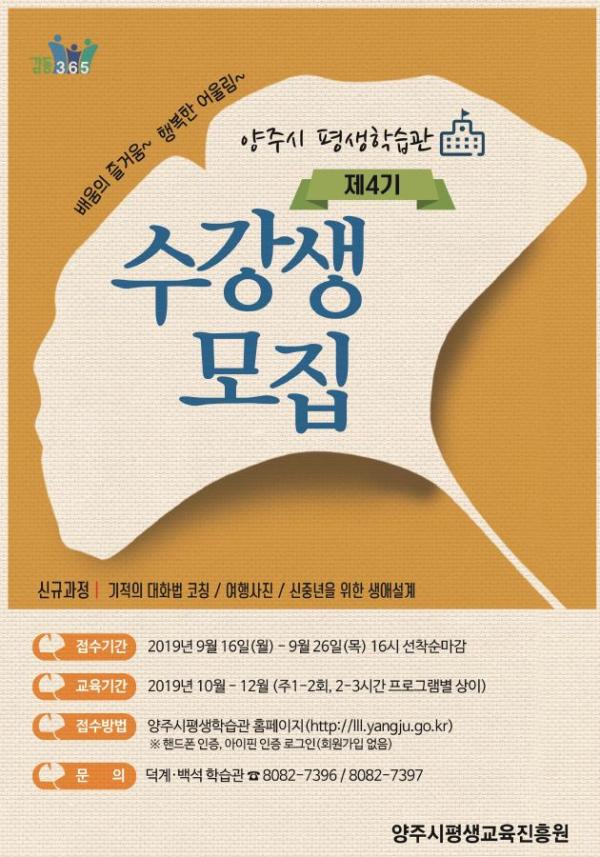 양주시 평생학습관은 오는 16일부터 26일까지 ‘제4기 프로그램 수강생’을 선착순으로 모집한다.