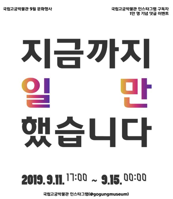 문화재청 국립고궁박물관은 현재 운영 중인 인스타그램 구독자 1만 명 돌파를 기념하여 오는 11일부터 15일까지 인스타그램 방문객을 대상으로 선물을 증정하는 행사 ‘지금까지 일만 했다’를 진행한다.
