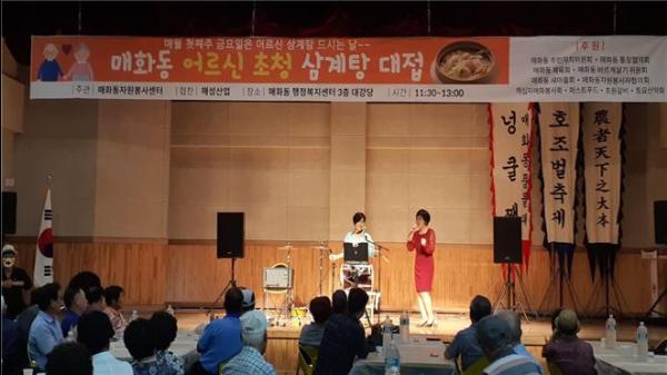 매화동 자원봉사센터는 추석 명절을 앞둔 지난 6일 관내 어르신 100명을 초청해 삼계탕을 대접했다.